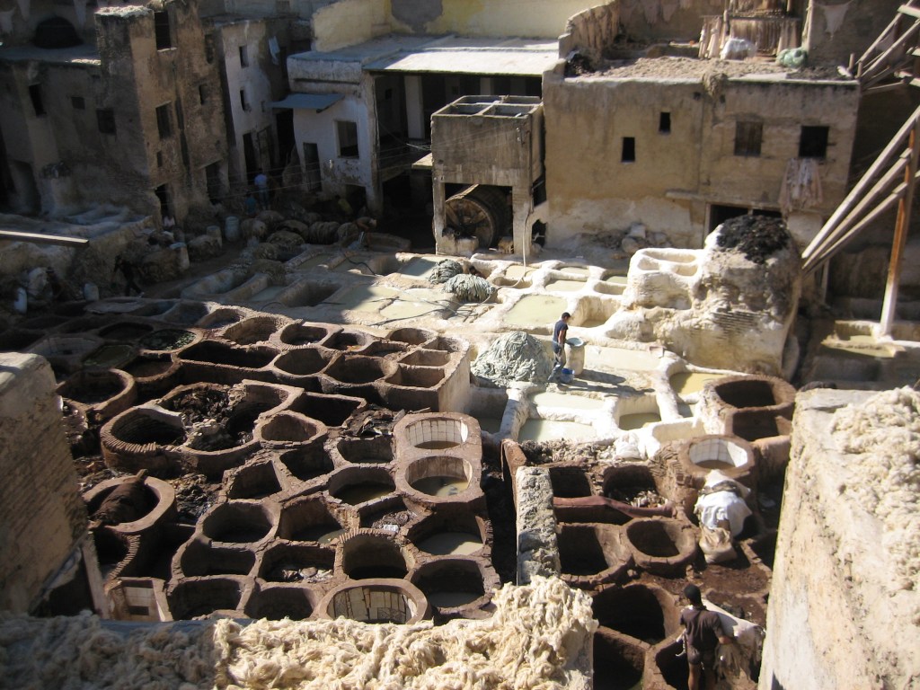 We went to the roof of a leather shop to see the leather tanning, is being done the old way – the gov’t subsidizes it to keep it profitable. There are lots of vats to cure the leather and it takes days to get the process done. Then they dry the skins on the roofs and later dye the skins. There are sheep, goat, cattle and camel skins.