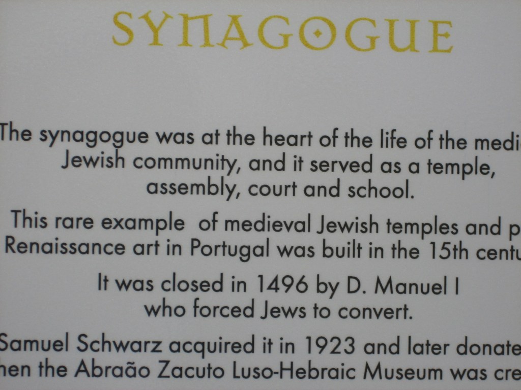 One of our stops was Tomar, which has a 15th century synagogue.  After the inquisition, the synagogue was closed and turned into a prison.  Today it is a Jewish Museum run by a family, who are re-discovering their roots and are learning Hebrew.  The sign below was on the wall of the old synagogue