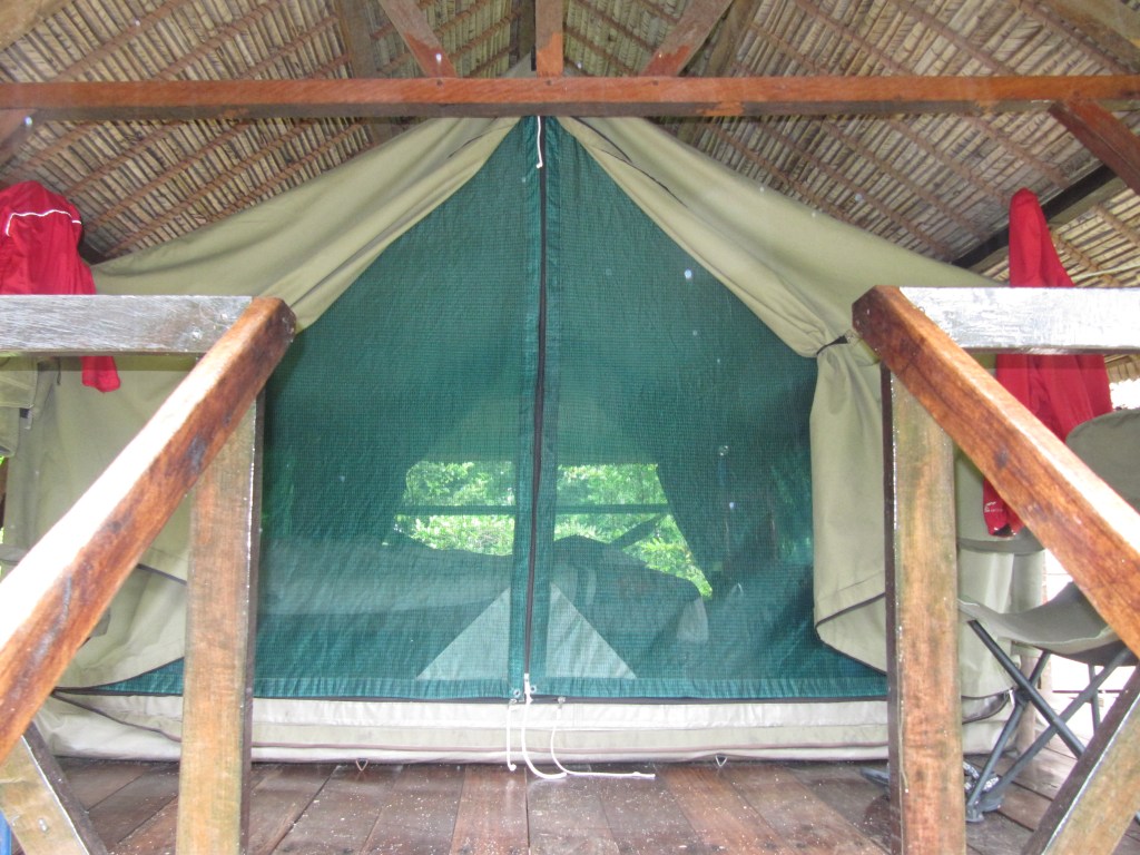 The Lodge is made up of six twin-tented cabins with adjoining private toilet/shower facilities for each cabin.  Each cabin also had a pleasant front porch and a small area in back with a hammock.  The dining room/meeting room was open and airy.