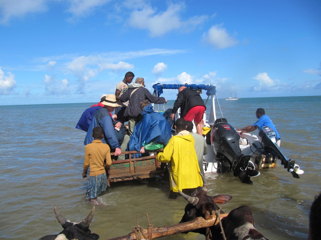 We flew from Tana to Toliara and then were transferred by van, and zebu (cattle) carts to the boat, which was docked about a mile out to sea due to the low tide.  To the left is our crew being moved from the Zebu cart to the boat.