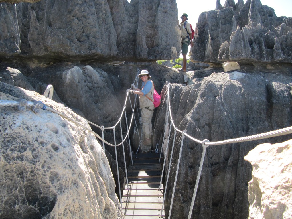 Hiking in the Petite Tsingy was invigorating and interesting but not very difficult.  However, hiking the Grand Tsingy is not for the faint of heart.  We wore harnesses with carabineers, which we hooked on wires bolted into the rocks. The climbing involved finding footholds, pulling ourselves up by the jagged rocks. Luckily I listened to instructions and brought gardening gloves to hold on to the rocks, which saved my hands.