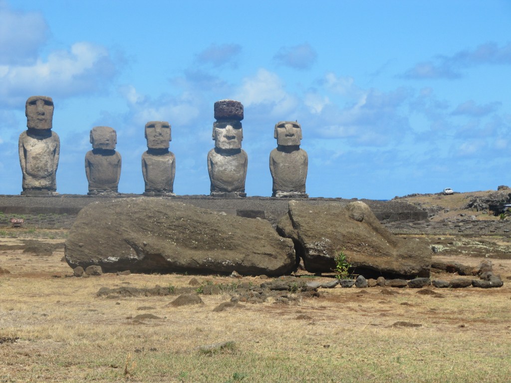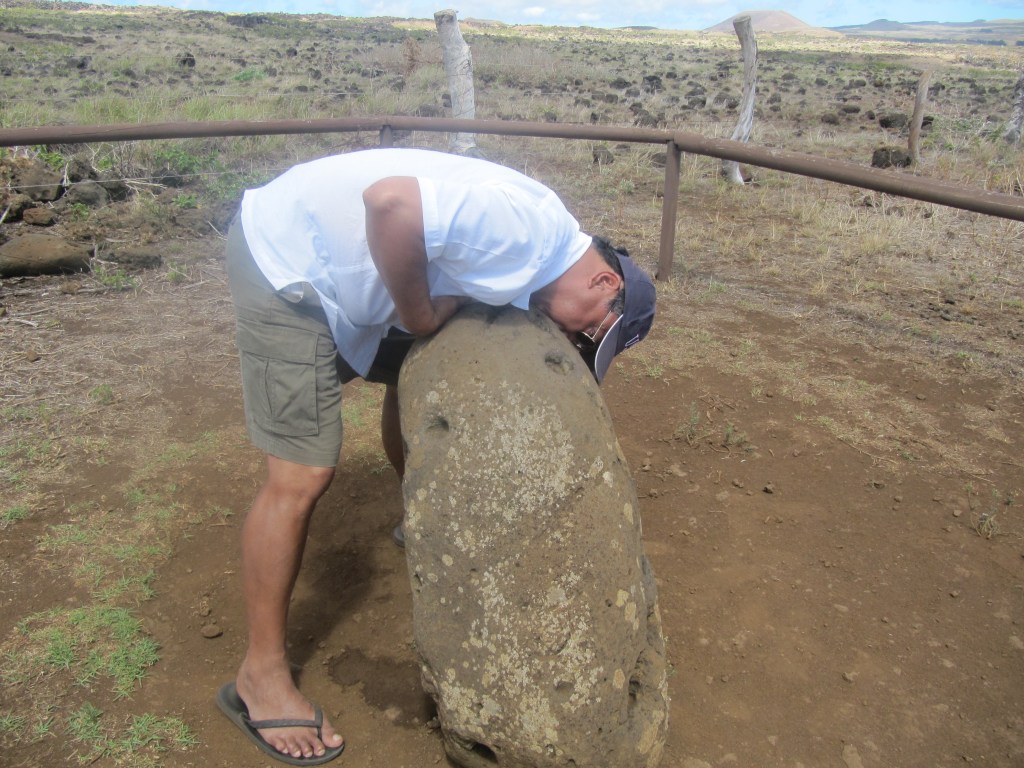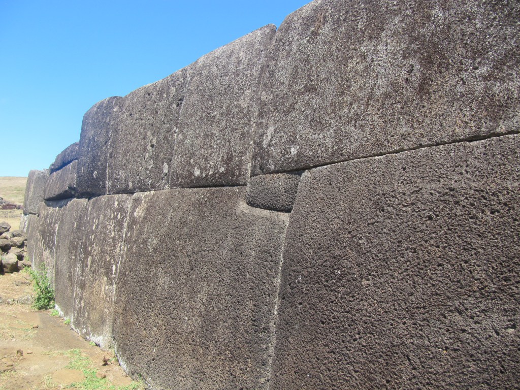 One of the wonderful sites was Ahu Tahira, with 5 Moai on an amazing platform made from very large stones – the kind that were used in Peruvian structures like Machu Picchu. (This is why some thought that Easter Islanders came from Peru.) The blocks fit perfectly and the engineering was amazing. There were fallen Moai behind the platform and the guessing is that after a time, when new ones were carved, the old ones were taken off and left behind. There were top-knots on the ground. These top-knots came from a different quarry, and were brought unfinished to the sites and then fitted to the head of the Moai. They are from a very different type of stone.