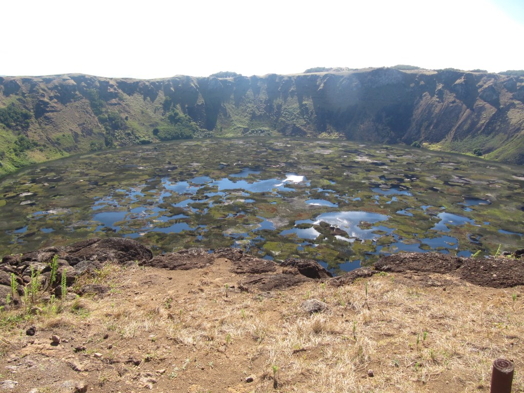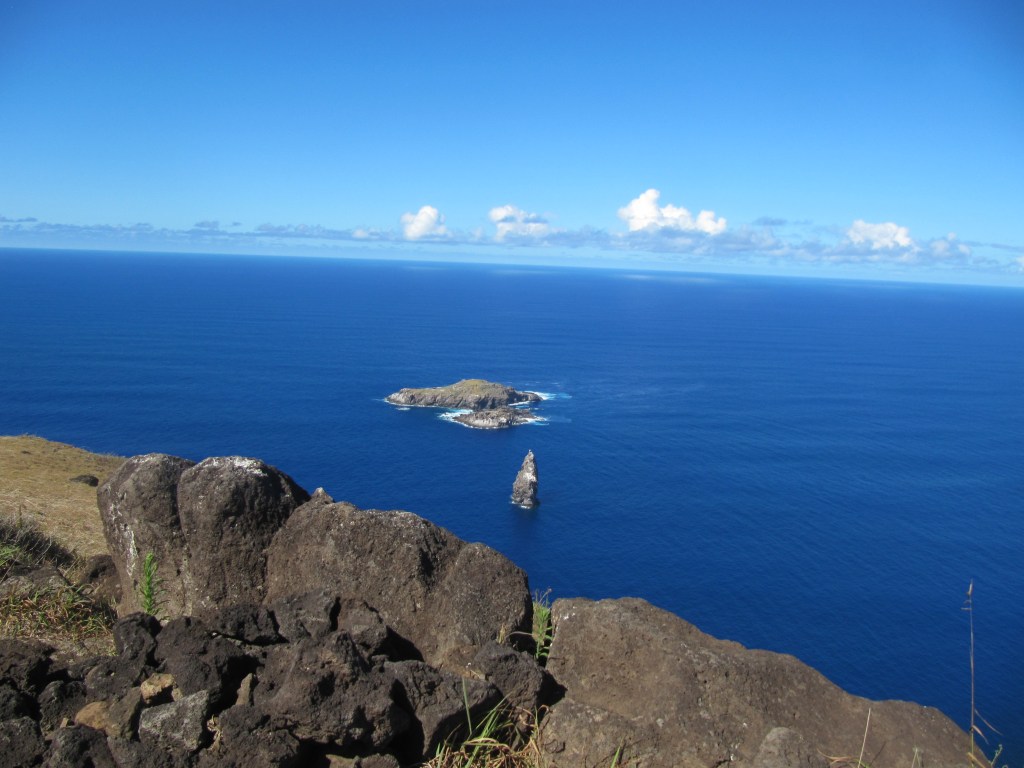 Near the crater, in the town of Orongo, the highest point, is where the Bird Man ceremony took place. 3 islands are visible from the top of the hill. One is actually just a huge rock (perpendicular island), one a fairly small island and a larger island.