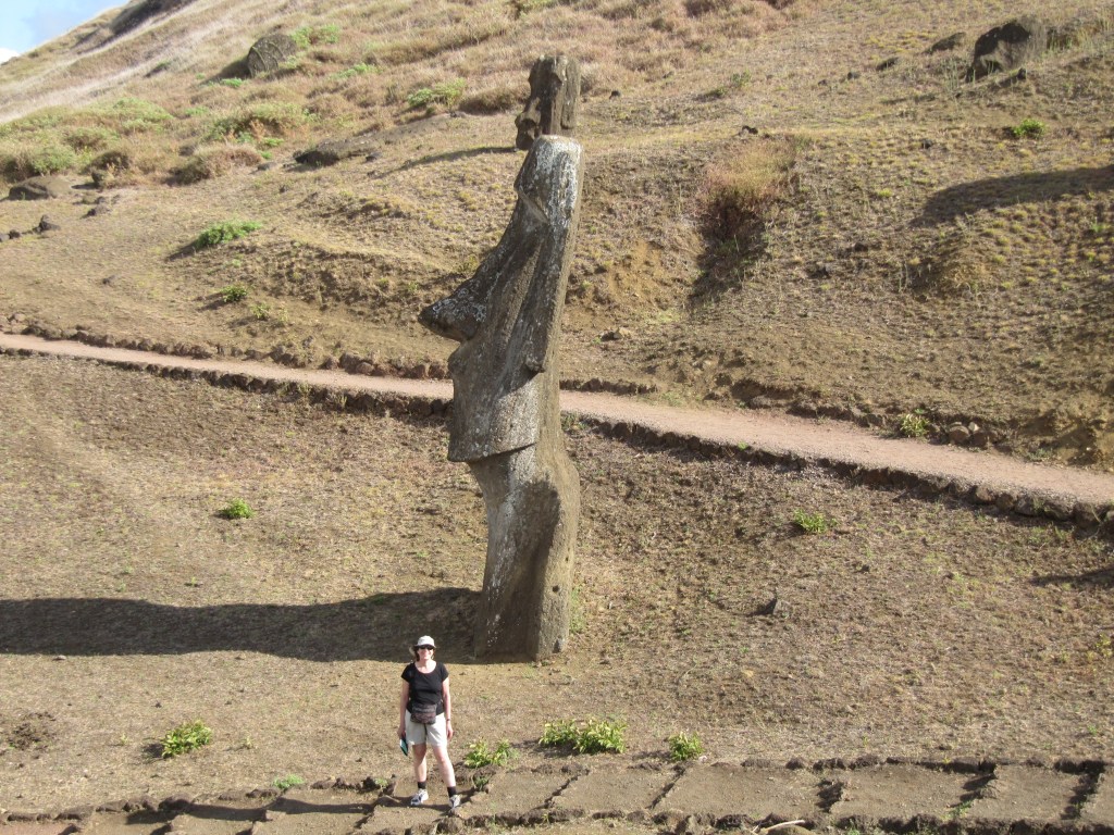 We walked up and down the trails. In some cases, we could get really close to the statues and could get the feel for just high and large they were. That speck in front of the Moai is me. This will give you a feel for their massiveness.