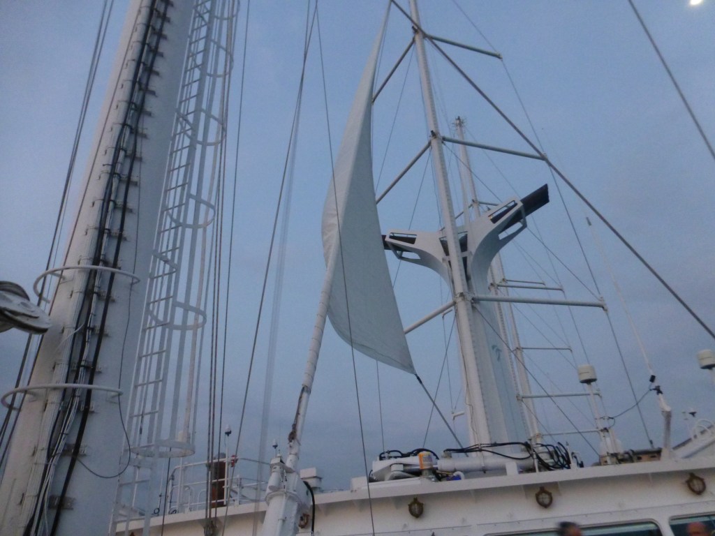 One evening we took zodiacs around the ship as the sun was setting on the sails. This photo gives a bit of the feel of what the ship looks like under sail.