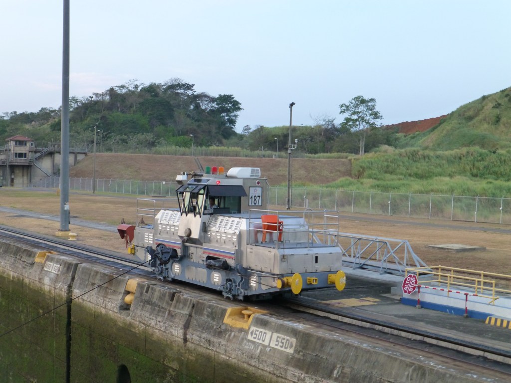 The ship was guided through the lock by means of 4 train cars. Two on each side in front and two each side in back. Rowboats came out and throw ropes to the boats to tie the trains to the boats. (This is different now in the new canal.)