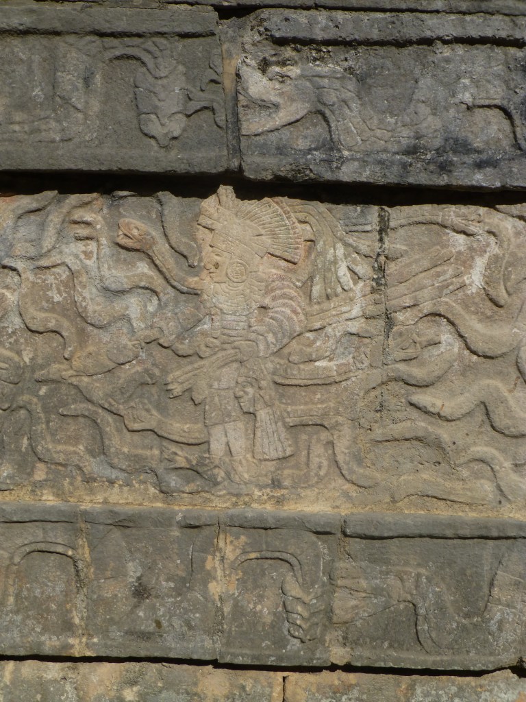 The pyramid is from about 1000 CE to 1200 CE, but above are earlier structures with carvings of snakes, birds, people. Some of the original color and stucco has remained.