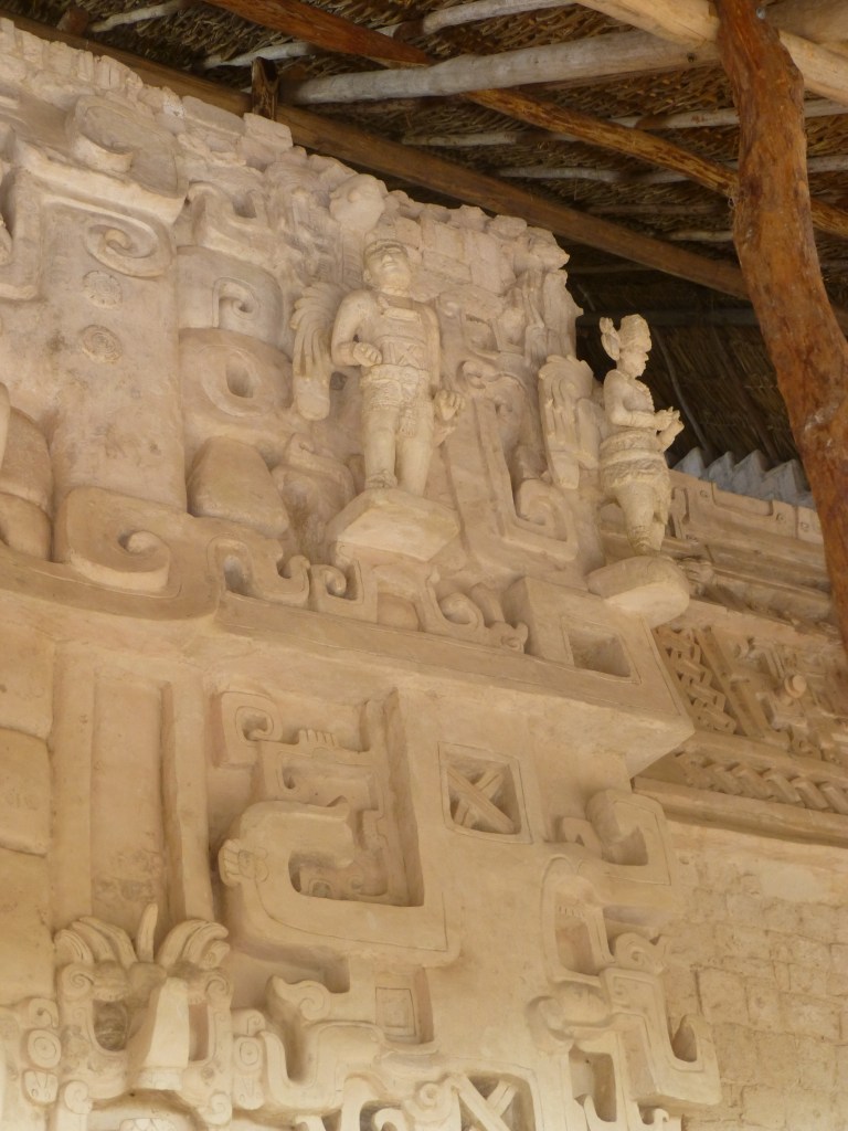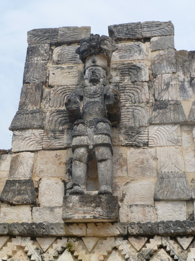 One of the buildings has 2 magnificent statues of men. The better-preserved figure is called “scar face” because he has tattoos on his cheeks. His legs are muscular from climbing hills. The other figure’s face is lost. Below the statues are relief carvings of warriors and their prisoner. Incidentally, we had the site to ourselves.