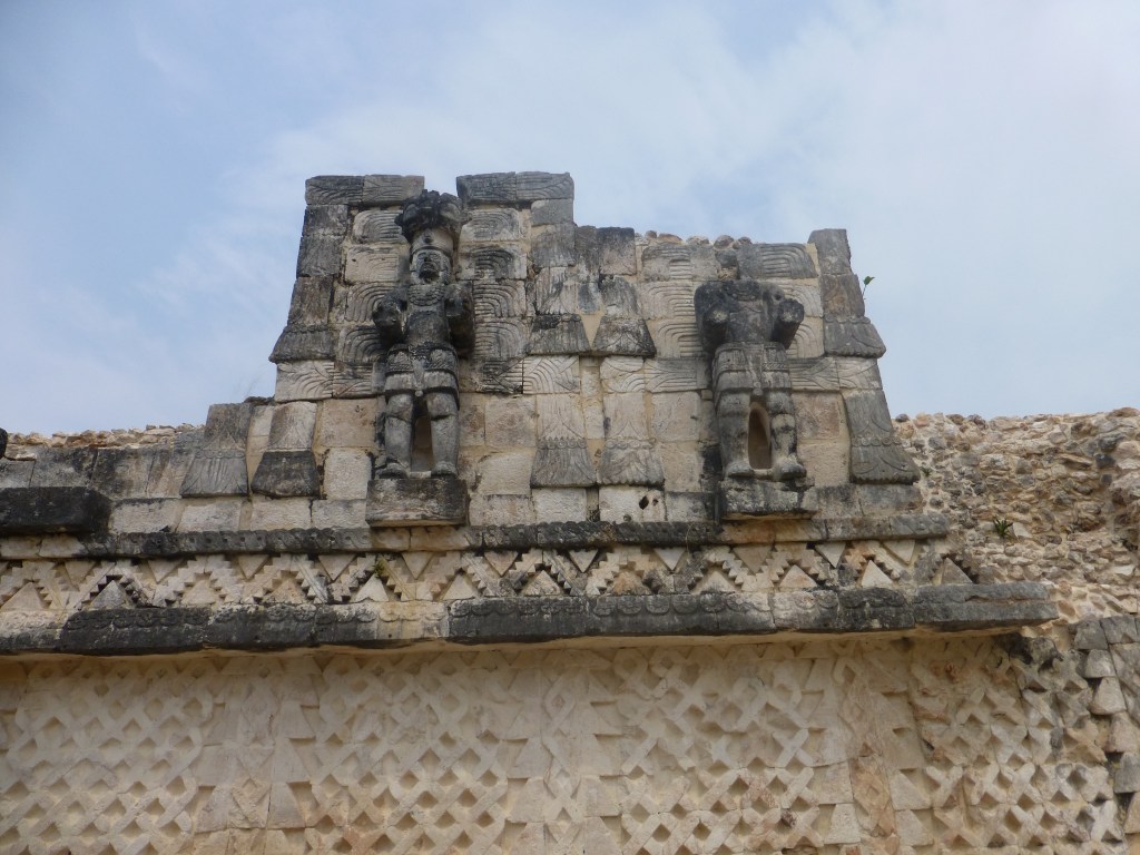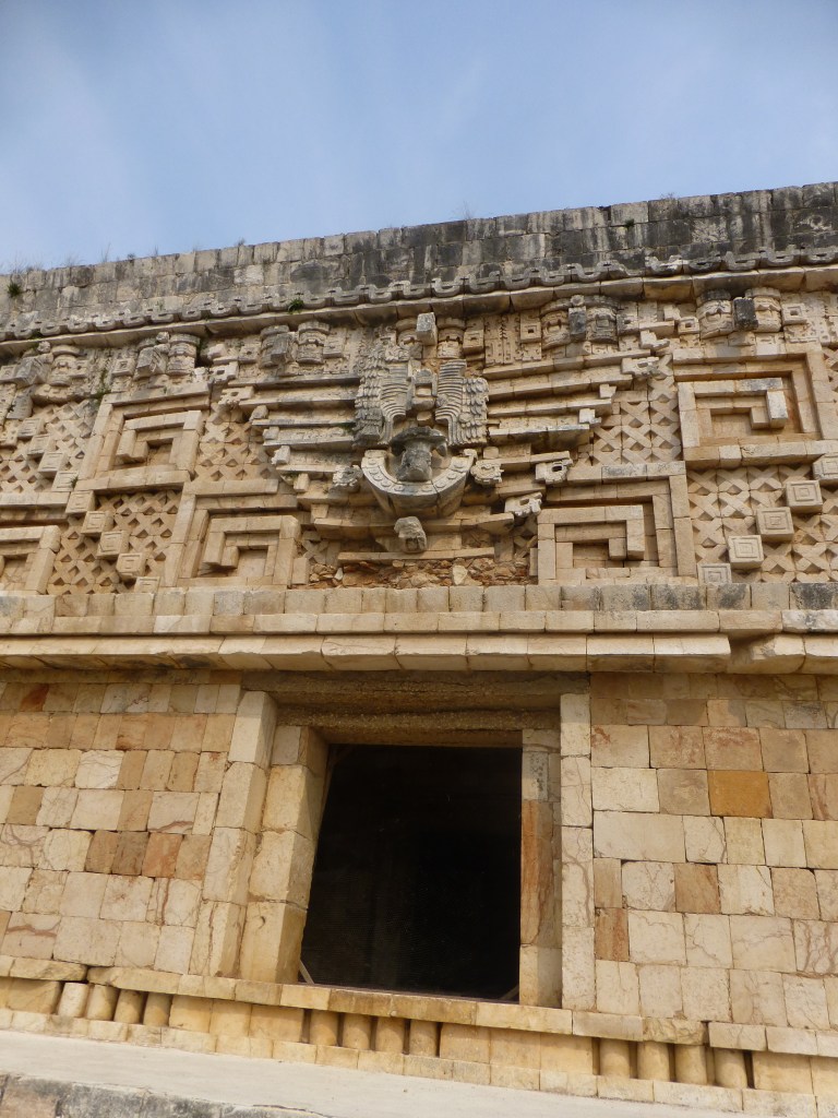 Uxmal is older than Chichen (600-900 CE). The main pyramid is smaller with only 3 levels. There were a number of pyramids just partially excavated. We were able to climb some structures to get a better look at the carvings.