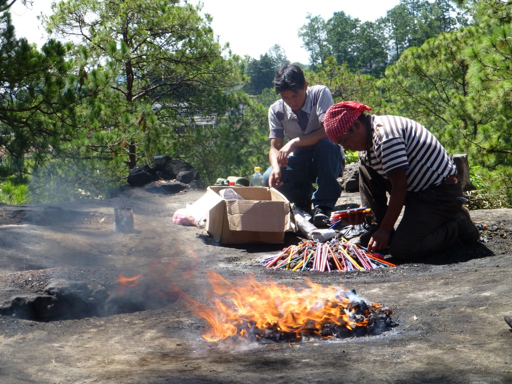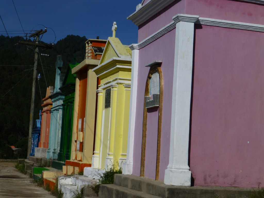 We saw these rituals performed in the church in town (on special altars), in the very colorful cemetery, by the graves of their ancestors, and up on the holy hill. The rituals involve burning long tapered candles, pouring various liquids on them and the use of incense in prayer.