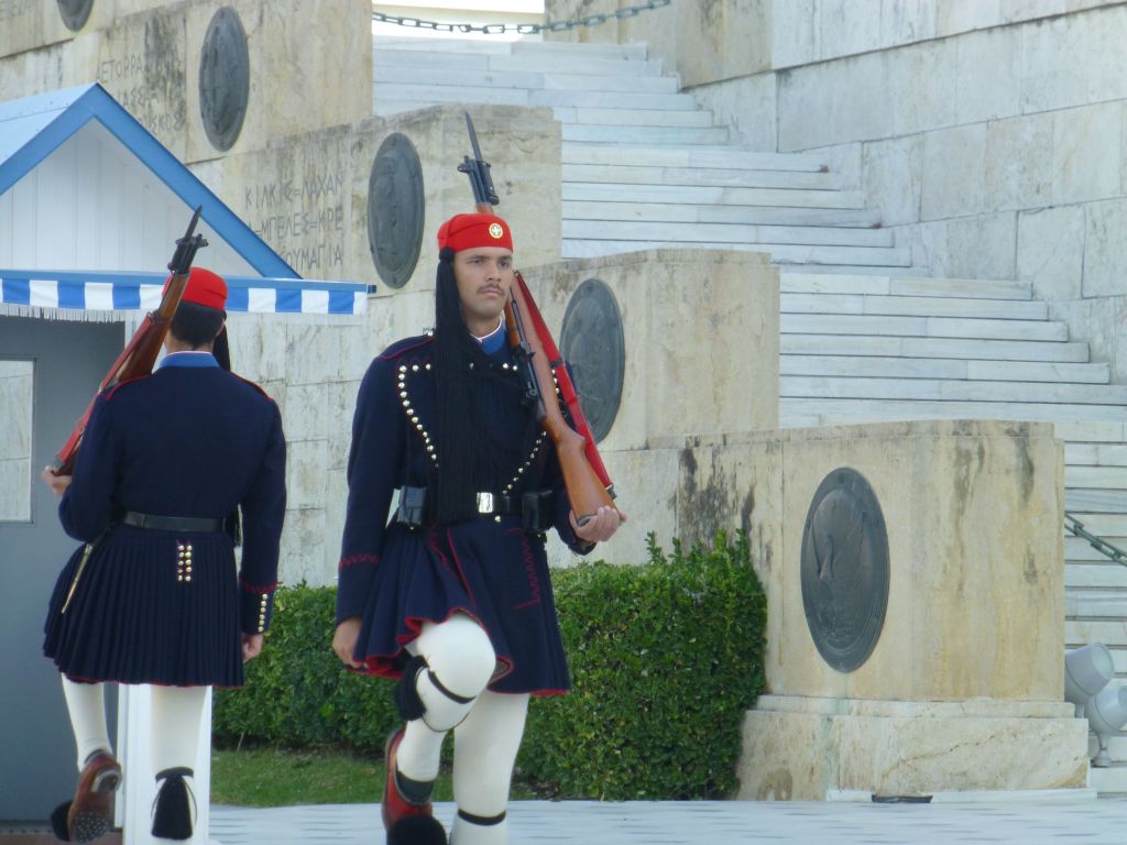 The Tomb of the Unknown Soldier is a must, if only to watch the Evzone infantry soldiers dressed in traditional dress, march around in a bizarre fashion with legs raised high. Their kilts have 400 pleats to represent the 400 years under Turkish domination.