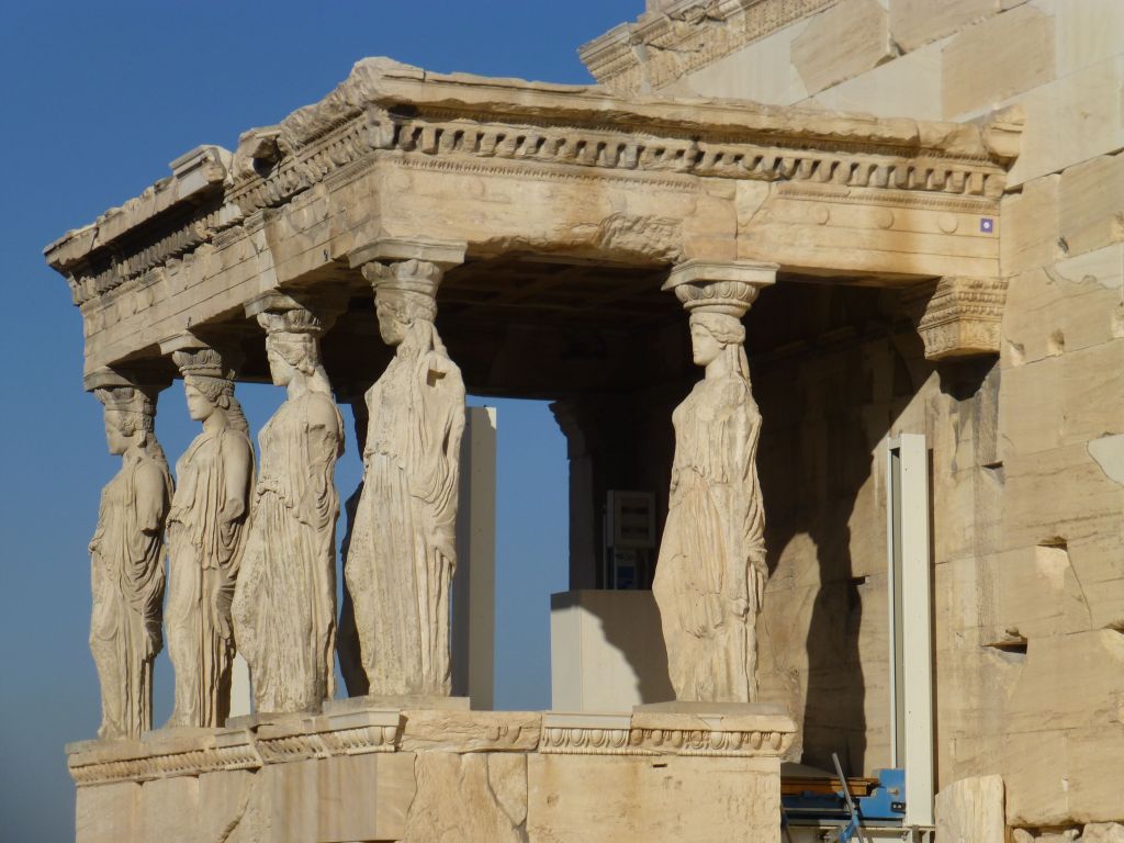 The building across from the Parthenon has six beautiful ladies acting as the pillars. The ones at the Acropolis are replicas, with 4 of the originals in the Acropolis Museum, one in France and one in England. They suffered a lot over the last 50 years and are safer in a museum.