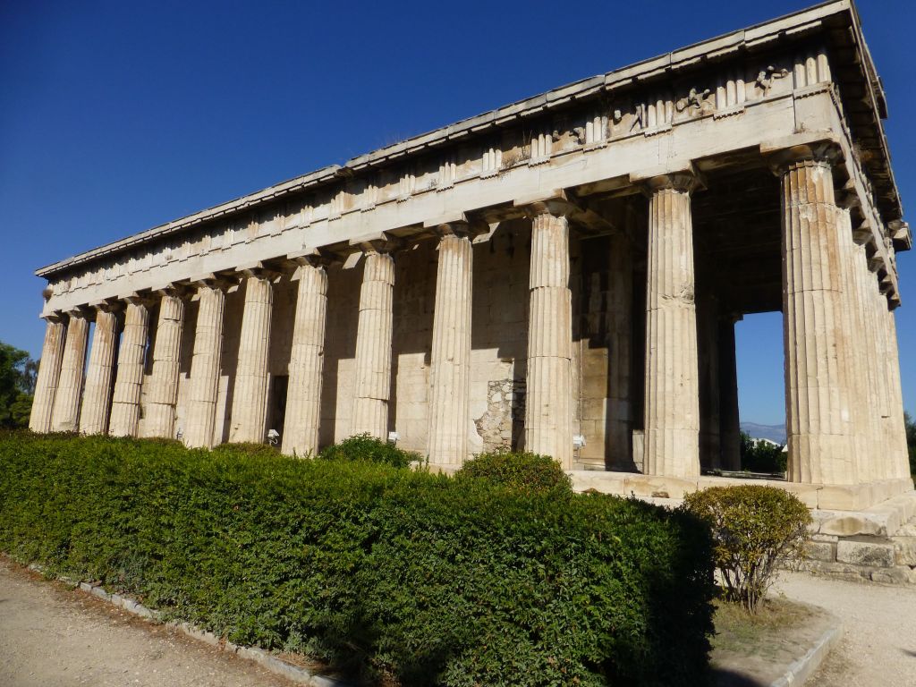 We continued in the Agora to look at the drainage system and then to the almost perfectly preserved Temple of Hephaistos. It was built about the time of the Parthenon (450 BCE) but was a much smaller structure. It is a Doric temple with the heavy columns and an inner structure.