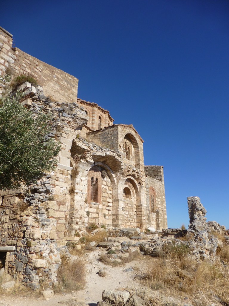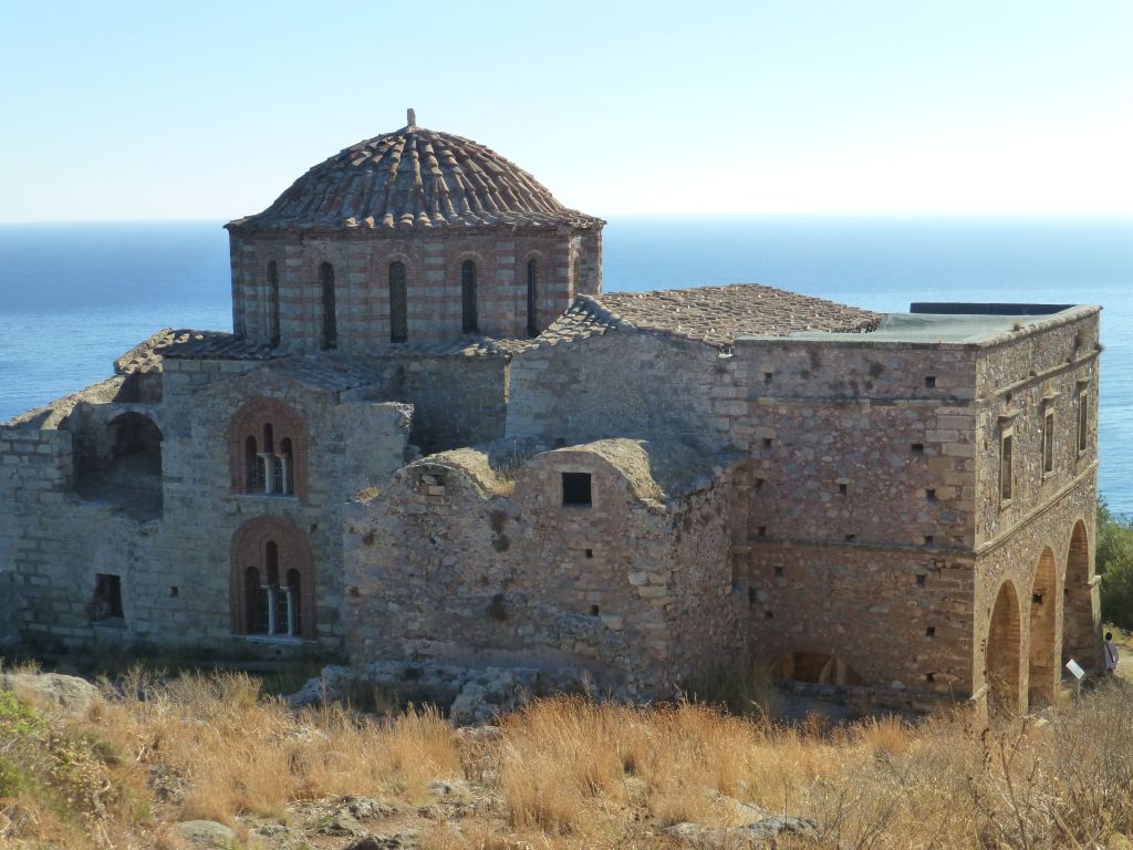 Our first port, Monemvasia is a town in Peloponnesia, which belongs to Greece. Peloponnesia is the ancient home of the Spartans, the warriors that fought Thebes. Spartans settled Monemvasia, south of Sparta, in the late sixth common century when they fled the Barbarian invasions. They built their houses along the sea below a towering mountain. This is what is now the old town. They also built fortifications, houses and a church on the mountain (the upper town). The old town was very limited in size, squeezed between the mountain and the sea, so there is now a new town across a causeway.