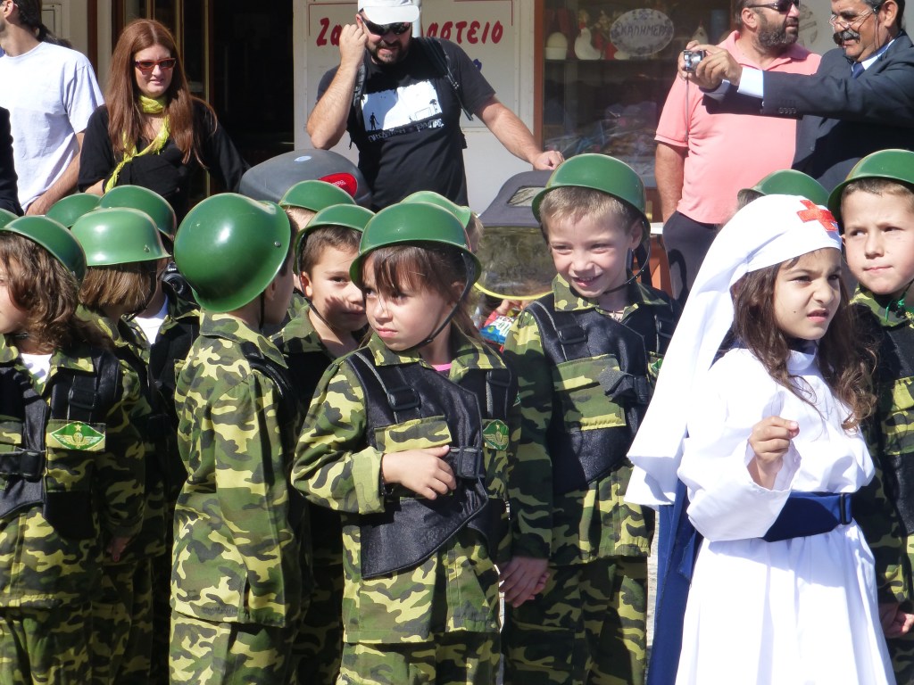 To celebrate this national holiday, each little town and village has a parade. We were there in time for the Areopolis parade, which consisted of 4 school groups walking to recorded music. The pre-school group wore army fatigues for the boys and nurses’ uniforms for the girls.