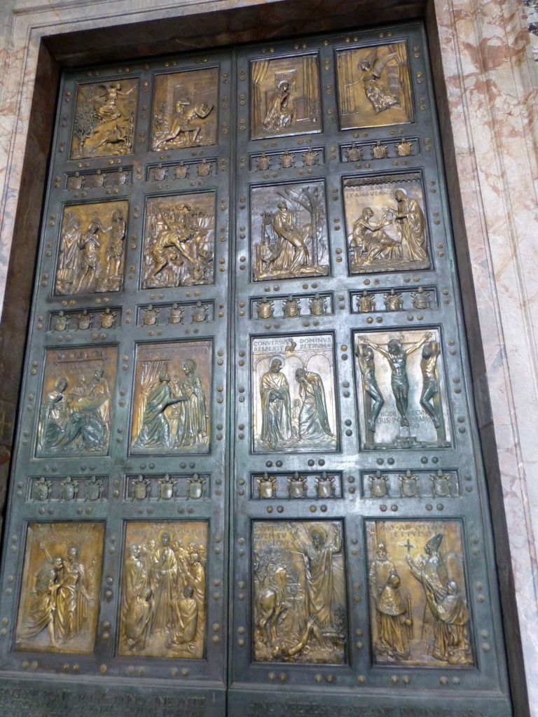 We saw a small portion of the Vatican Museum, the magnificent Sistine Chapel and the awesome St. Peter’s Basilica. We had a guide, who made reservations ahead of time and knew a side way to get up to the museum, saving us precious time. Guarding the Vatican are the Swiss guards who are dressed in the Renaissance outfits that Michelangelo created. To the right is the door to St. Peter’s Basilica.
