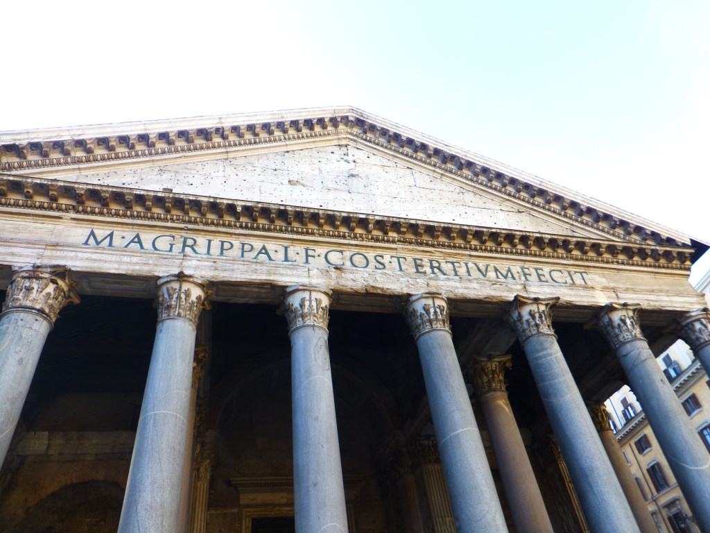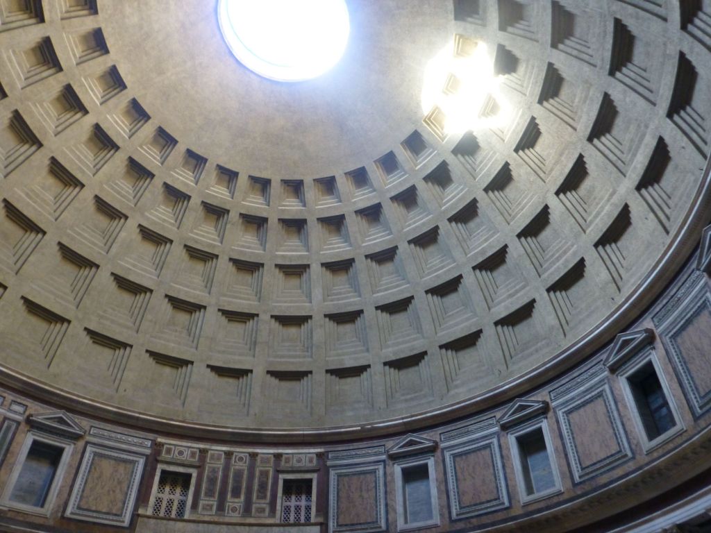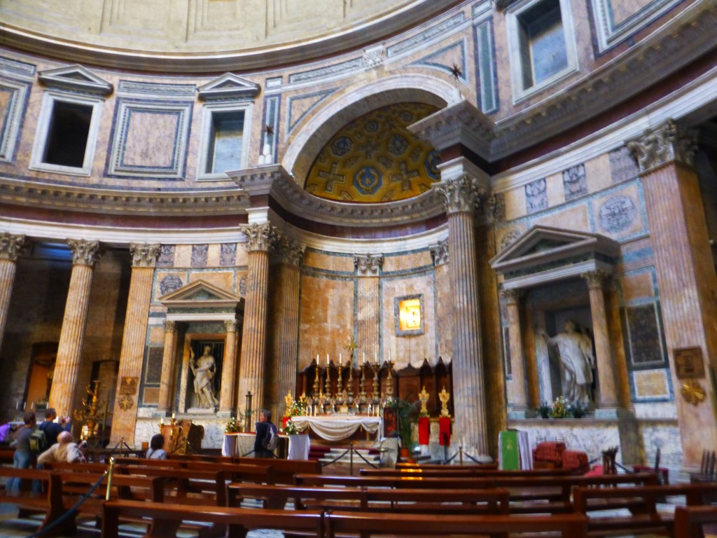 The Pantheon started life as a pagan temple. It is the first example of a round building with a very high beautiful dome. The dome is not covered so if it rains, the rain comes into the Pantheon and drains down. Just don’t stand in the center on a rainy day. Unlike other pagan temples, the Pantheon survived almost intact because it was converted to a church. The pagan god statues were removed and saints put in their place, but the columns, wall decoration and feel survives.