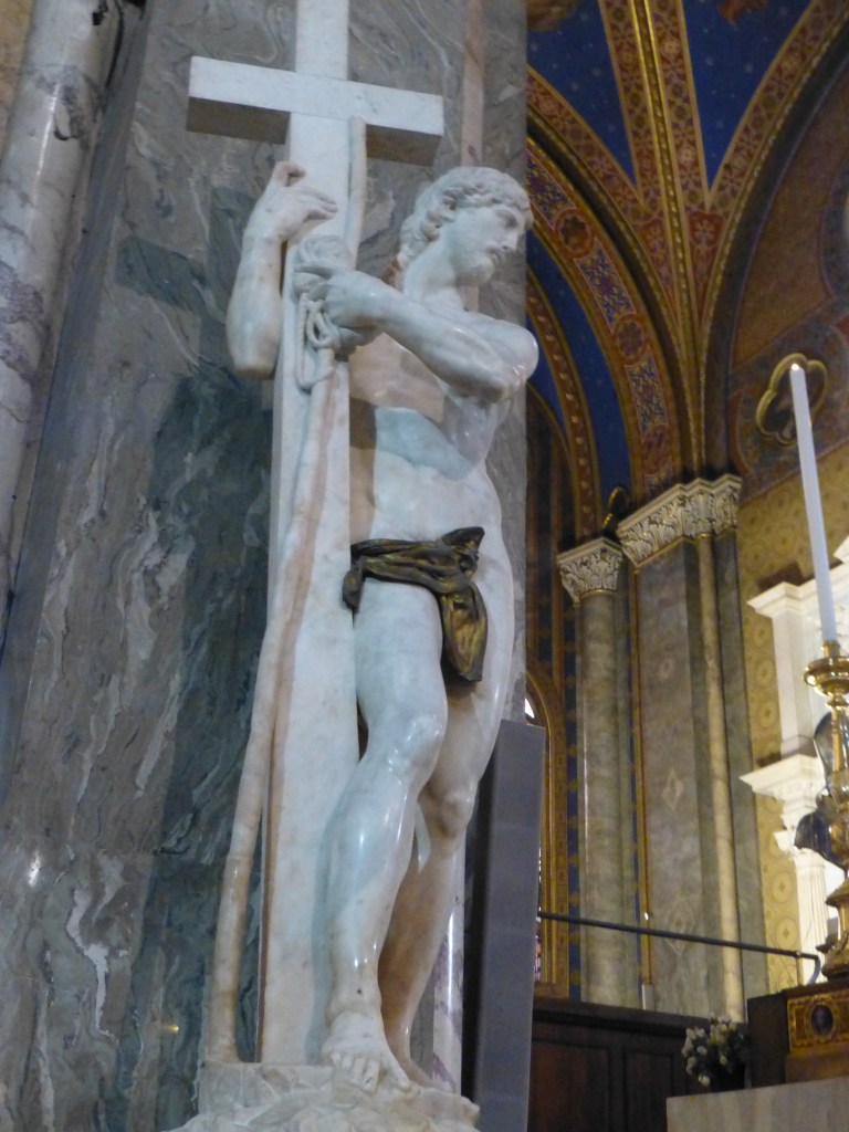 A little-known church, Santa Maria Sopra Minerva, has a Michelangelo statue of Jesus. This church would be on everyone’s guide book in another city, but here in Rome, it competes with a huge number of other magnificent churches, it had maybe a dozen visitors while we were there. The marble statue of Jesus is beautiful and peaceful. At some point, the church leaders decided that the naked Jesus needed a bronze loincloth. The loincloth is still there.