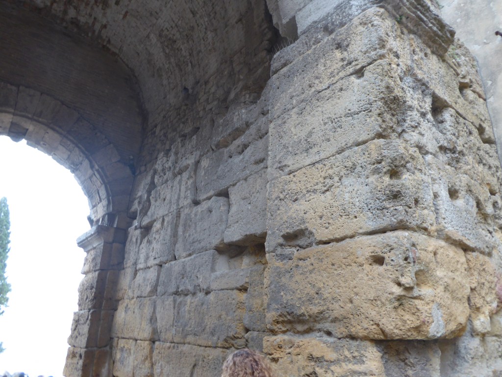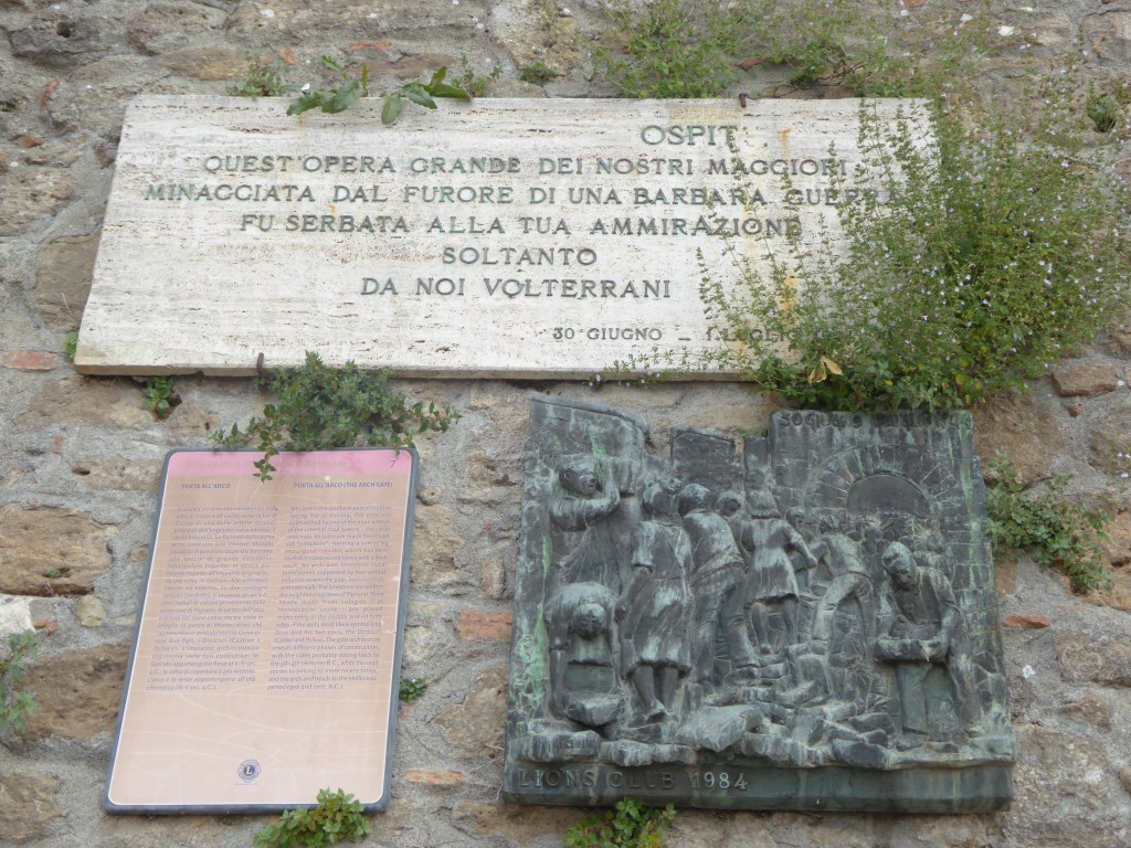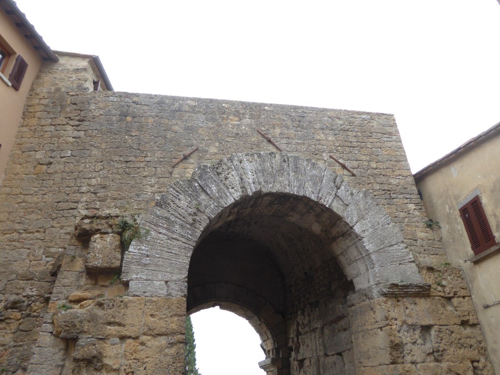 Only an arch remains from the original 5-mile wall. It is the oldest fully rounded arch in existence. The stones making up the base of the arch are enormous. This arch was almost blown up in WWII. After the Italians threw over Mussolini and joined the Allies, the Germans, as they were retreating, had orders to blow up the arch so that there would be no entrance for the allies into Volterra. When the locals heard that this was planned, they worked around the clock for 24 hours and dug up all the stones from the Main Street and piled them up in the arch.
