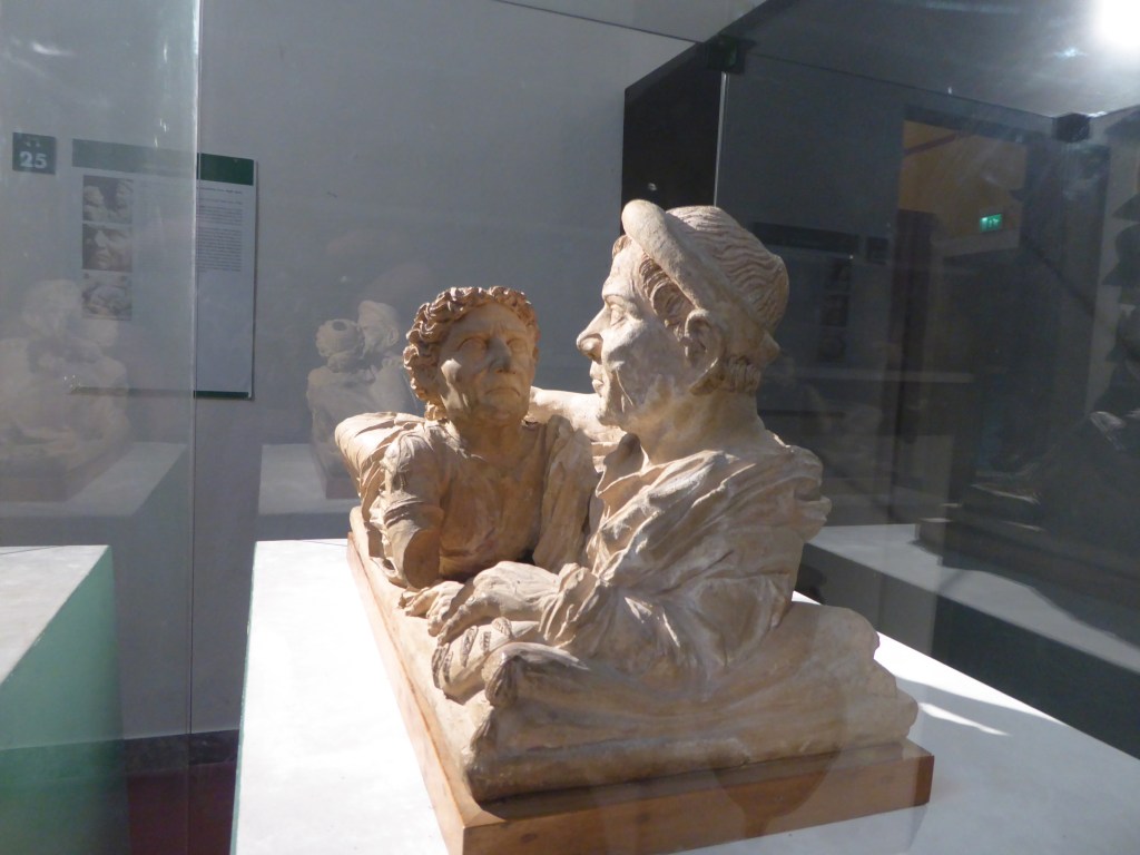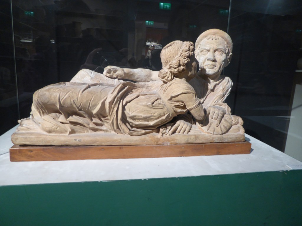 This museum has the best Etruscan Urn collection and the fifth best Etruscan collection. The graves housed all the things that the person would need in the afterlife and the urns held the deceased’s remains. About 30% of the people were buried in urns. Archaeologists learned that in the Etruscan society, men and women were pretty equal. Women could hold responsible positions. They would be the ones to name their children. My favorite urn had a sculpture of the husband and wife on top of the urn. They were so beautifully carved with their older faces, obviously still in love. (Pictured in the center and on the right.)