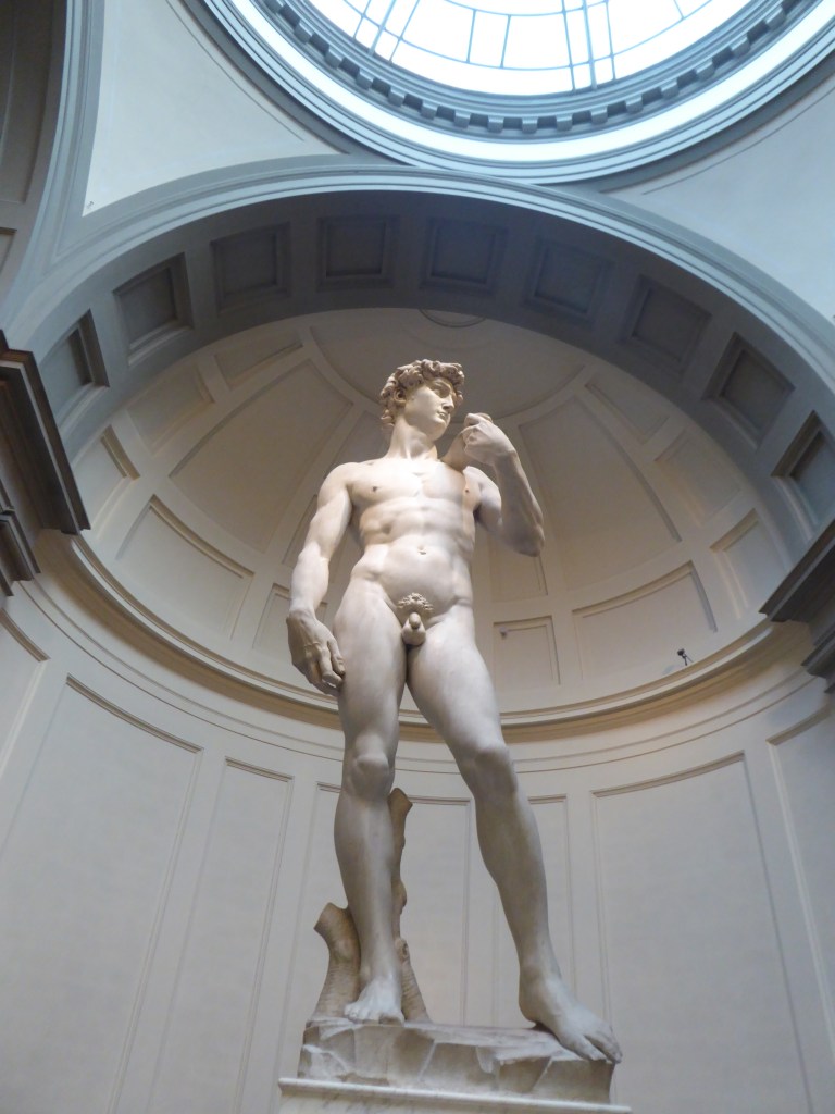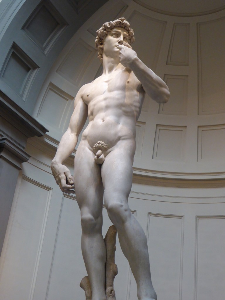 Michelangelo sculpted the David from a piece of marble that had been cut 40 years earlier and other artists had trouble carving. What Michelangelo did with this piece of marble is just amazing. David is huge, he is manly. The expression on his face is enigmatic. You can see the veins in his neck and his arms. One can just gaze and gaze.