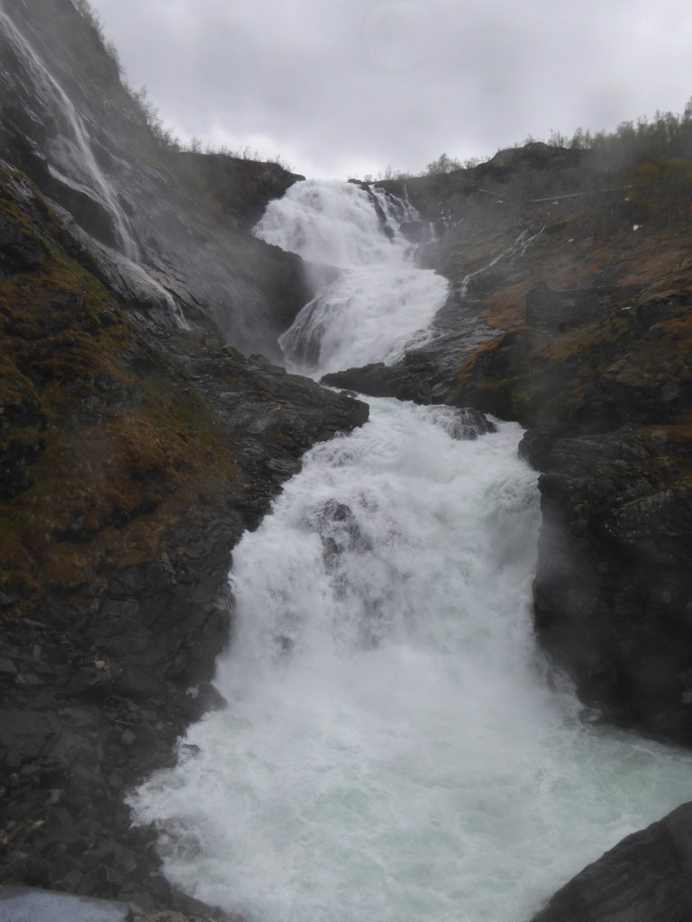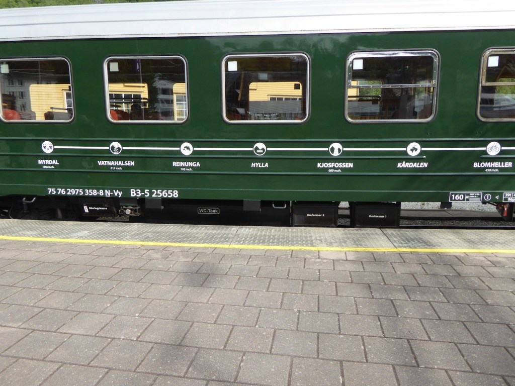 We booked the Flam Railroad excursion, through a beautiful gorge up the mountain. Here are some facts about the train: It was started in 1920 and it took 20 years to build. There are 20 tunnels through the mountain. The train goes up for 20 Kilometers/12 miles at a gradient of 55% for most of the ride.