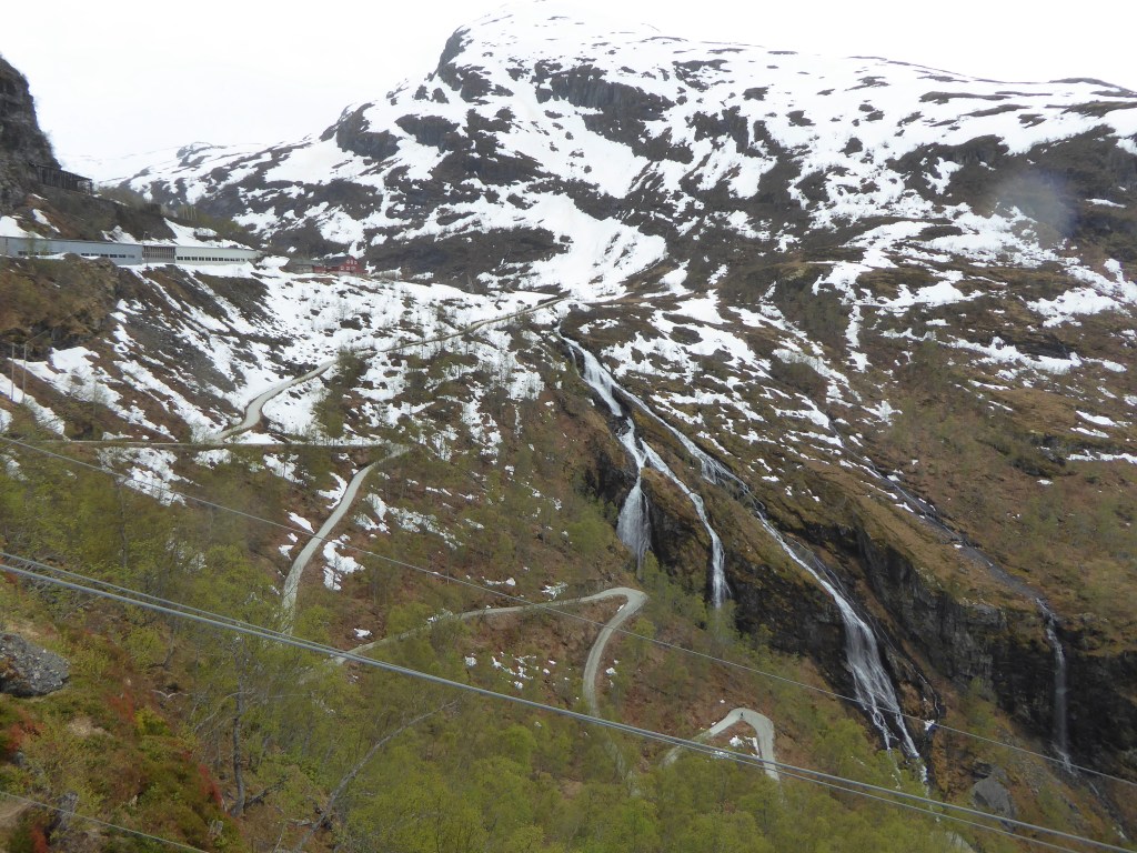 As the train climbed we kept seeing magnificent waterfalls. It was hard to resist photographing them. The mountains are rugged and covered by evergreens. The deciduous trees had brand new leaves on them and yes, there was also a lot of snow.