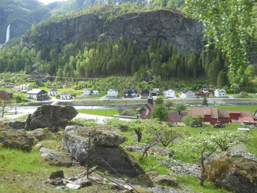 We took the next train back into Flam and had a couple of hours to roam in this town of 500 inhabitants. It has a few stores and a bakery and a hotel. We ate a muffin and sat at the hotel grounds to check email.