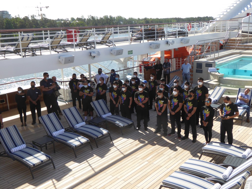 On Philippine Independence Day, the ship held a flag raising ceremony, because many of the crew is from the Philippines. It was a very moving ceremony. A number of the crew spoke. One young lady started the ceremony with a prayer for better conditions in Philippines – less corruption. Then we heard a brief history of Philippines from the Spanish invasion, to the British, then US control and Commonwealth status by U.S. Then in WWII the Japanese invaded and finally the country won its Independence in 1946. The crew does not take independence for granted like the US citizens do. They have had very little of it.