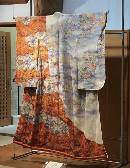 The Itchiku Kubota Art Museum, which was only a 10-minute walk from the hotel was a delightful museum. When we walked into the main room, I saw huge Kimonos, with beautiful colors on the fabric, hanging around the room. At first I thought that these were ancient ceremonial kimonos, but they were much too large for a person to wear. I was directed to a video and learned that we were seeing modern works of art by Itchiku (1917-2003). He apprenticed at age 14 and started making costumes at age 20. About that time, he saw an exhibit of ancient tie-dyed fabrics from the Muromachi era (1500 to 1600). The tie-dye process was labor intensive and died out when new techniques were invented that were time savers.