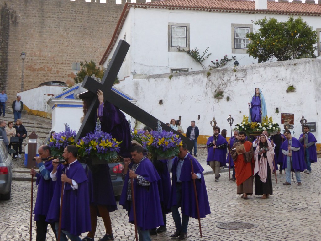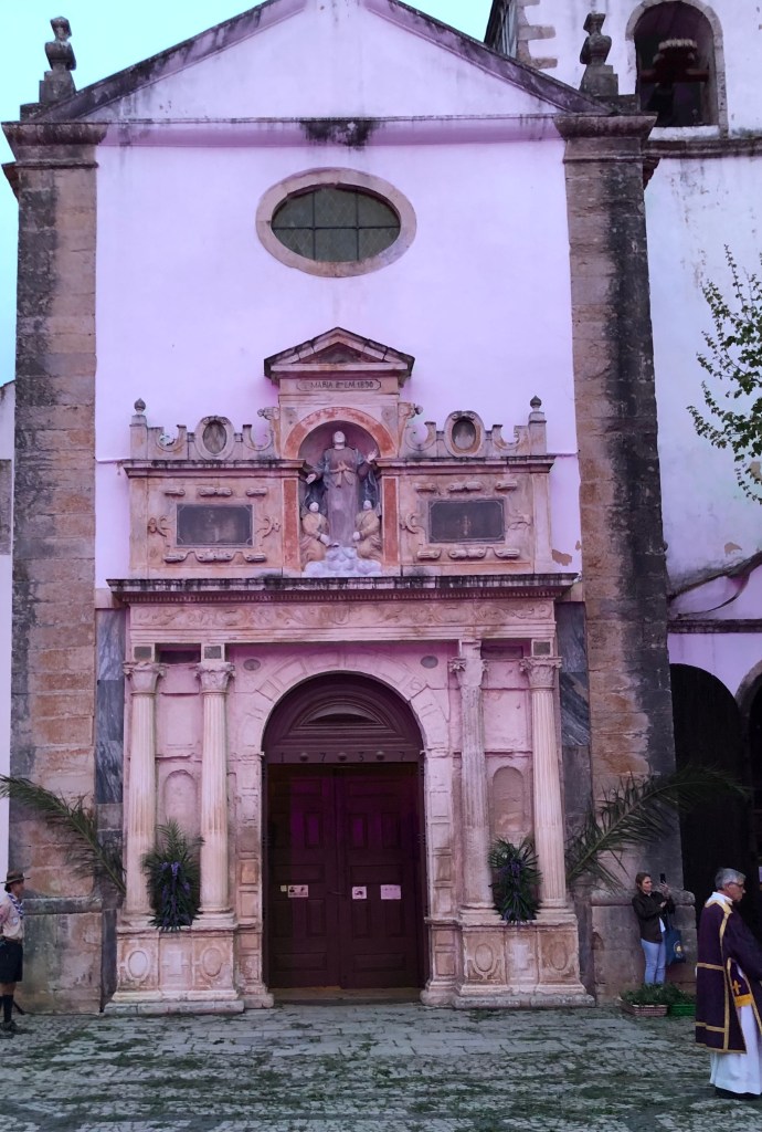 Obidos was my favorite of the trip. Our timing was fantastic – we arrived at our hotel for our evening orientation tour just as the Palm Sunday procession was passing behind our hotel, which was one short street from the walled city. I had never experienced this kind of procession: first came priests dressed in purple with incense, then a huge bier with a statue of Jesus and then another with a statue of Mary. This was followed by many more priests and towns people walking with lavender branches. There were singers and a band playing mournful songs as well as lots of bell ringing. It was all very exciting. The procession snaked around the walled city and therefore we saw it a few other times as we toured the town.