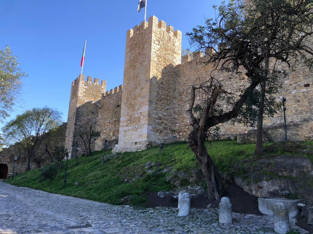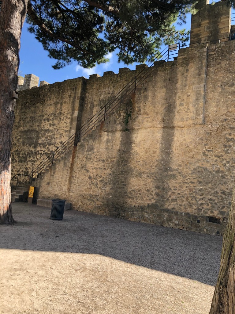 Lisbon is a city of hills. On one hill is Castle of Sao Jorge, a strategically located fortification built by the Romans in the 2nd century BCE. In the 12th century it became a royal palace and military barracks for the conquering Catholics. The walls were renovated in the 20th century.