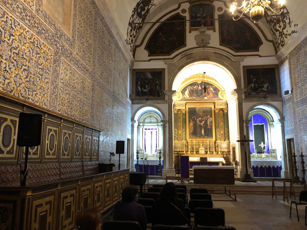 In our free time in Obidos we revisited the various churches that we had seen the night before during the procession. I especially enjoyed the Alm House Church, which housed the statues when they were not in the procession. It is a lovely, Moorish looking church with tiles around the walls.